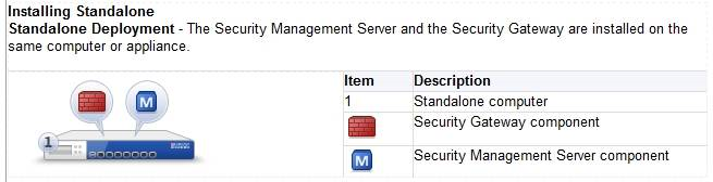 Installing Standalone Standalone Deployment - The Security Management Server and the Security Gateway are installed on the same computer or appliance.   Reference: https://sc1.checkpoint.com/documents/R76/CP_R76_Installation_and_Upgrade_Guide-webAdmin/89230.htm#o98246