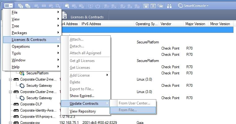 Using SmartUpdate: If you already use an NGX R65 (or higher) Security Management / Provider-1 / Multi-Domain Management Server, SmartUpdate allows you to import the service contract file that you have downloaded in Step #3. Open SmartUpdate and from the Launch Menu select 'Licenses & Contracts' -> 'Update Contracts' -> 'From File...' and provide the path to the file you have downloaded in Step #3:   Note: If SmartUpdate is connected to the Internet, you can download the service contract file directly from the UserCenter without going through the download and import steps.Reference: https://supportcenter.checkpoint.com/supportcenter/portal?eventSubmit_doGoviewsolutiondetails=&solutionid=sk33089