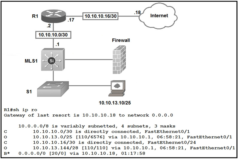 Refer to the exhibit. Which type of route does R1 use to reach host 10.10.13.10/32?
