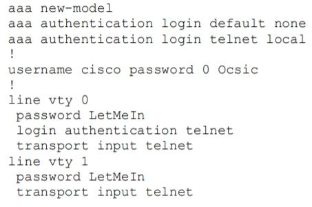 vty 0:+ cisco + 0csic vty 1:+ no username + no password The command “aaa authentication login default none” means no authentication is required when access to the device via Console/VTY/AUX so if one interface does not specify another login authentication method (via the “login authentication …” command), it will allow to access without requiring username or password. In this case VTY 1 does not specify another authentication login method so it will use the default method (which is “none” in this case).