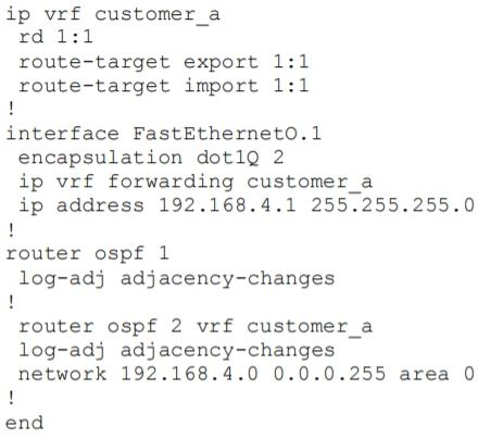 Refer to the exhibit. The network administrator configured VRF lite for customer A. The technician at the remote site misconfigured VRF on the router.