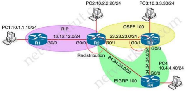Refer to the exhibit. Redistribution is enabled between the routing protocols, and now PC2 PC3, and PC4 cannot reach PC1.