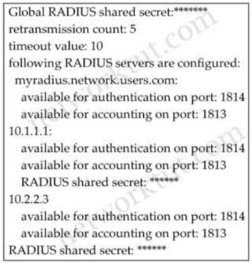 By default, RADIUS uses UDP port 1812 for authentication and port 1813 for accounting. In the exhibit above we see port 1814 is being used for authentication to AAA server at 10.1.1.1 which is not the default port so we must adjust the authentication port to the default value 1812.
