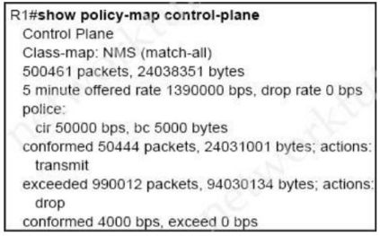 The class-map NMS in the exhibit did not classify traffic into specific protocols so many packets were dropped. We should create some class-map to classify the receiving traffic. It is also a recommendation of CoPP/CPP policy:“Developing a CPP policy starts with the classification of the control plane traffic. To that end, the control plane traffic needs to be first identified and separated into different class maps.” Reference: https://ptgmedia.pearsoncmg.com/images/9781587143694/downloads/i9781587143694_app02.pdf