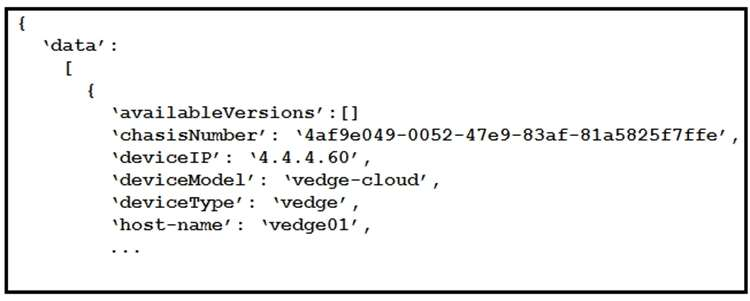Refer to the exhibit. A Python script has been created that calls the Cisco SD-WAN vManage Device Inventory API to get the list of vEdges. The JSON