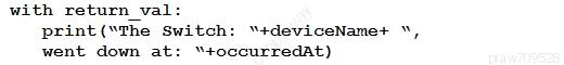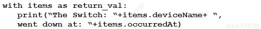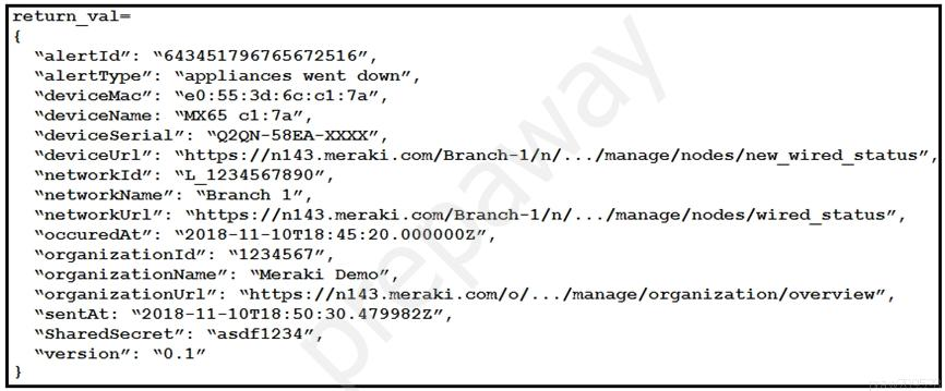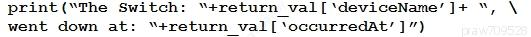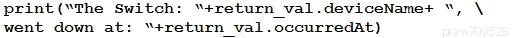 Refer to the exhibit. The task is to create a Python script to display an alert message when a Meraki MX Security Appliance goes down. The exhibit shows sample data that is received. Which Python snippet displays the device name and the time at which the switch went down?