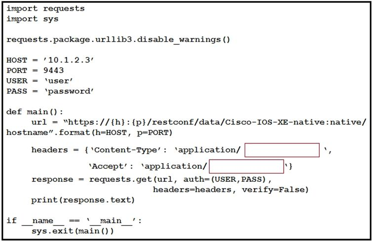 Refer to the exhibit. An engineer creates a Python script using RESTCONF to display hostname information. The code must be completed so that it can be tested. Which string completes the highlighted areas in the exhibit?