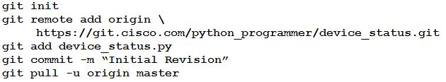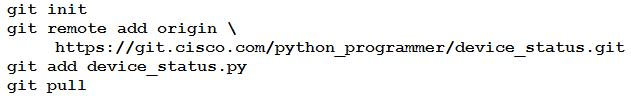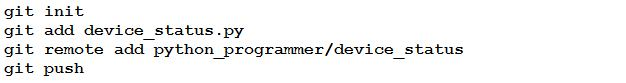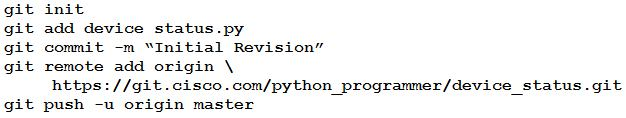 A new project called “device_status” must be stored in a central Git repository called “device_status” with the first file named “device_status.py”. The Git repository is created using the account python_programmer. Which set of commands inserts the project into Git?