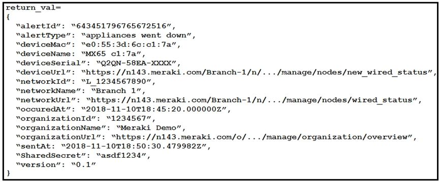 Refer to the exhibit. The task is to create a Python script to display an alert message when a Meraki MX Security Appliance goes down. The exhibit shows sample data that is received. Which Python snippet displays the device name and the time at which the switch went down?