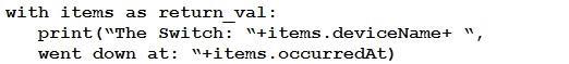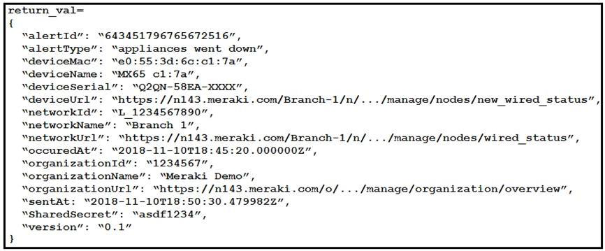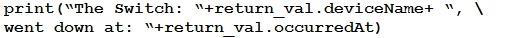 Refer to the exhibit. The task is to create a Python script to display an alert message when a Meraki MX Security Appliance goes down. The exhibit shows sample data that is received. Which Python snippet displays the device name and the time at which the switch went down?