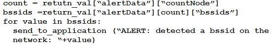 Refer to the exhibit. The goal is to write a Python script to automatically send a message to an external messaging application when a rogue AP is detected on the network. The message should include the broadcast SSID that is in the alert. A function called "send_to_application" is created, and this is the declaration: