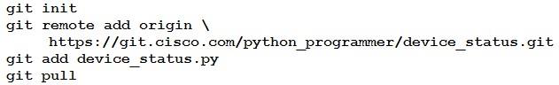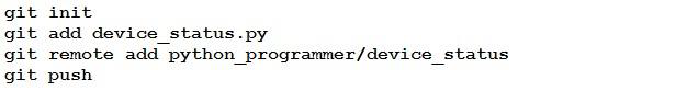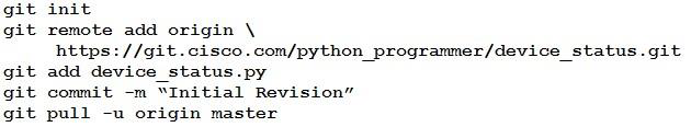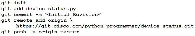A new project called "device_status" must be stored in a central Git repository called "device_status" with the first file named "device_status.py". The Git repository is created using the account python_programmer. Which set of commands inserts the project into Git?