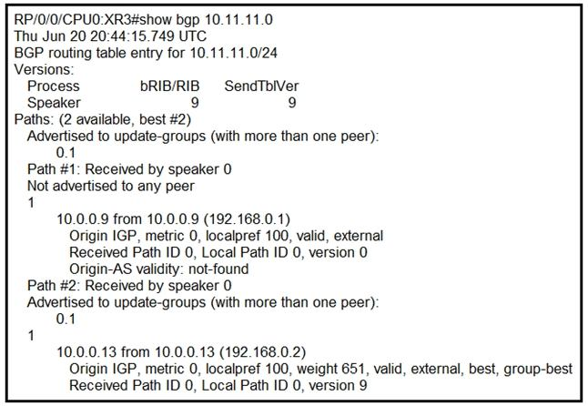 Refer to the exhibit. A network operator is getting the route for 10.11.11 0/24 from two upstream providers on #XR3. The network operator must configure #XR3 to force the 10.11.11.0/24 prefix to route via next hop of 10.0.0.9 as primary when available. Which of these can the operator use the routing policy language for, to enforce this traffic forwarding path?
