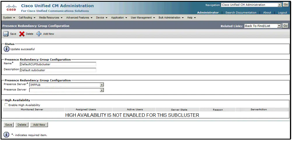 4. Add IMPSub as a secondary presence server in the redundancy group.