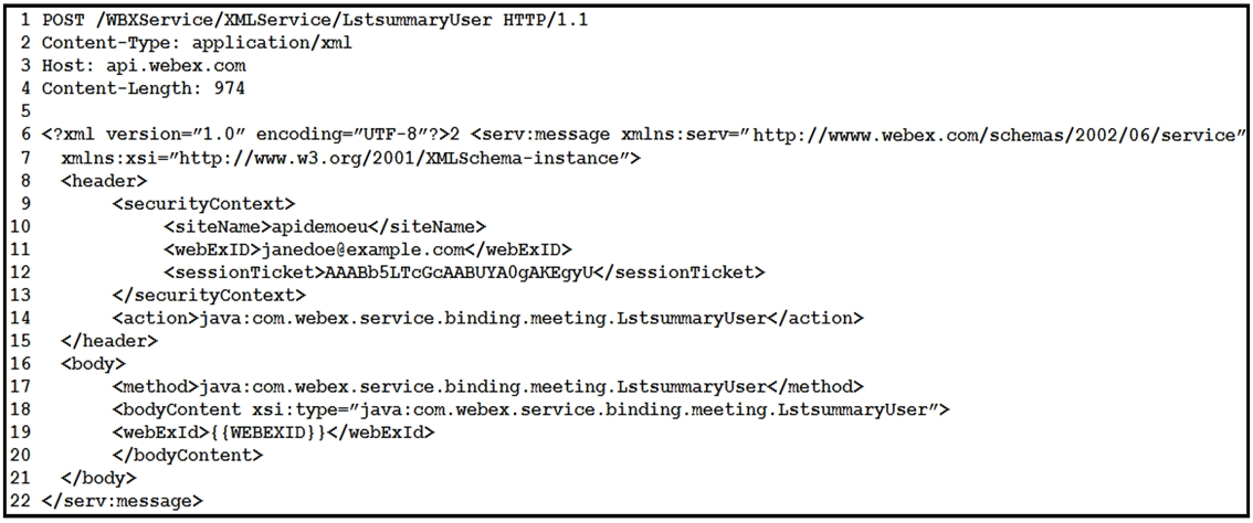 Refer to the exhibit. A Webex Meetings XML API HTTP request message with several invalid portions is shown. Which reference points to a line in the exhibit that correctly indicates that this is a LstsummaryUser request?