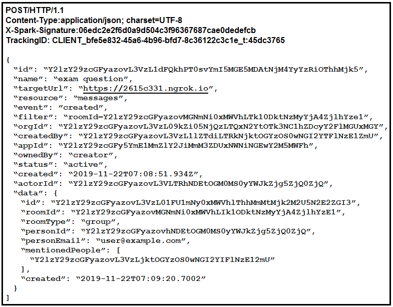 Refer to the exhibit. A bot is receiving notifications such as the one displayed in the exhibit. Drag and drop the code onto the snippet to complete the API request that was sent to Webex Teams so that the bot will receive these notifications. Not all options are used.