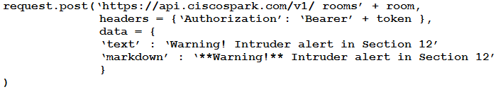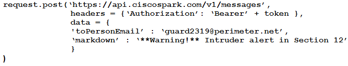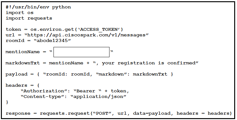 This Python script automates the creation of a Webex Teams space and adds participants to the space. Drag and drop code on the snippet to complete the script.