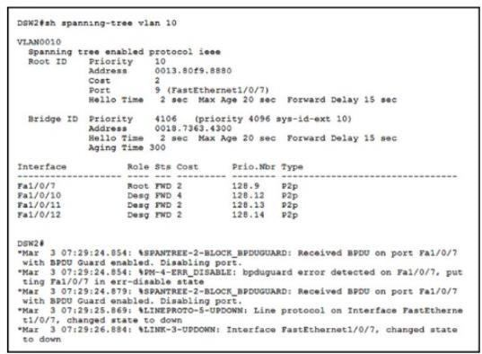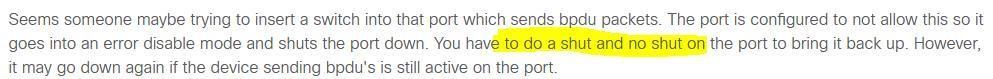 4. It remains in err-disabled state until the spanning-tree portfast bpduguard disable command is entered in the interface configuration mode.