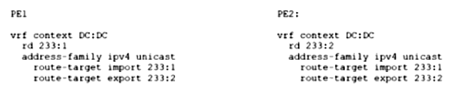An engineer must add a new VRF (DC:DC) to the network that runs with Multiprotocol Border Gateway Protocol (MP-BGP) and EVPN. The requirement for the new VRF is to allow communication of network prefixes between PE1 and PE2. Which two sets of steps should be taken to complete the VRF configuration? (Choose two.)