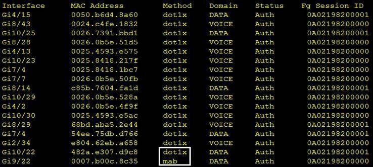 Which command was used to generate this output and to show which ports are authenticating with dot1x or mab?