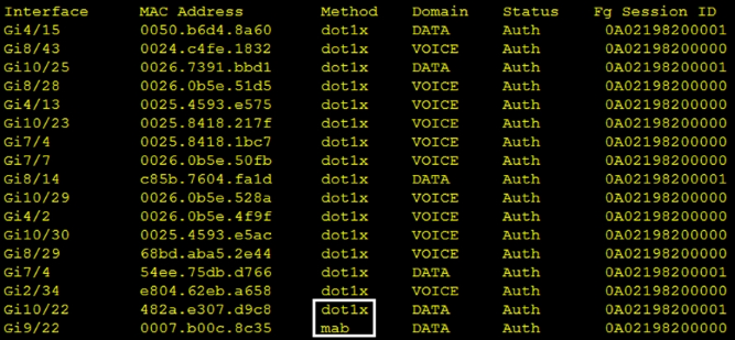 Refer to the exhibit. Which command was used to generate this output and to show which ports are authenticating with dot1x or mab?