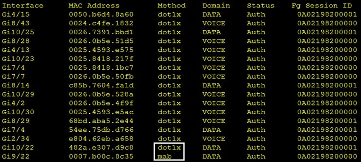 Refer to the exhibit. Which command was used to generate this output and to show which ports are authenticating with dot1x or mab?