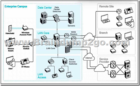 Refer to the exhibit. What are two ways remote sites or branches connect to the enterprise campus network? (Choose two.)