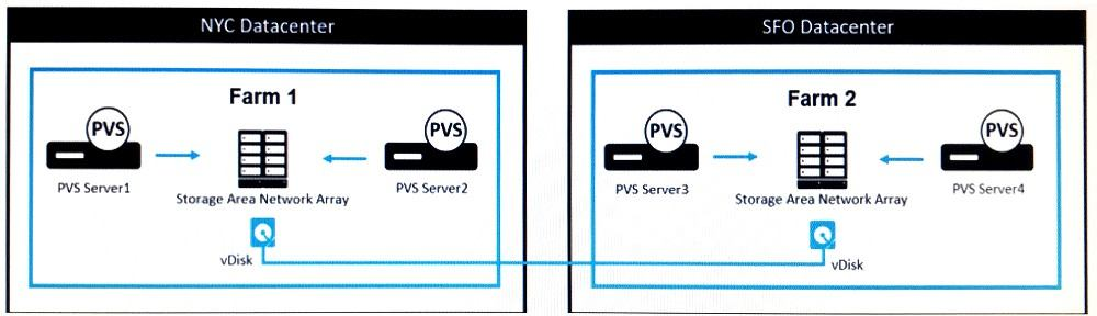 Scenario: A Citrix Architect needs to design a multi-datacenter XenApp and XenDesktop environment that will use Provisioning Services (PVS) to manage Virtual Delivery Agent (VDA) machine images. Each datacenter will have a separate Provisioning Services farm. During the design discussions, the architect creates a diagram to depict the way vDisk files will be replicated between PVS farms, based on the available storage for the vDisk Stores.