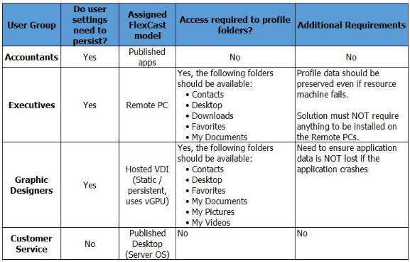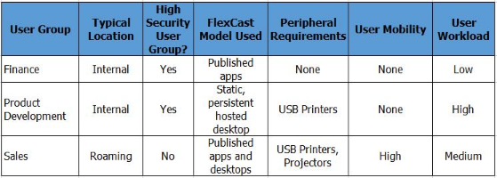 Scenario: A Citrix Architect is designing a new XenApp and XenDesktop environment and needs to determine which endpoints to include. Based on discussions with various departments, the user requirements listed in the Exhibit were collected.