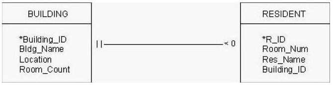Consider the Information Engineering diagram shown in the exhibit. Building_ID, R_ID, Room_Count and Room_Num are integer numbers, whereas Bldg_Name, Location and Res_Name are all represented by variable-length strings with a maximum of 20 characters.