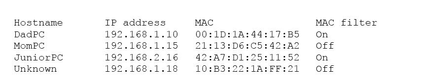 A user suspects someone has been accessing a home network without permission by spoofing the MAC address of an authorized system. While attempting to determine if an authorized user is logged into the home network, the user reviews the wireless router, which shows the following table for systems that are currently on the home network.