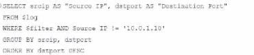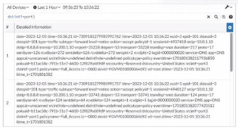 In this exhibit, we observe a search query on the FortiAnalyzer interface displaying log data with details about the connection events, including fields like date, srcip, dstip, service, and dstintf. This setup allows for several functionalities within FortiAnalyzer.