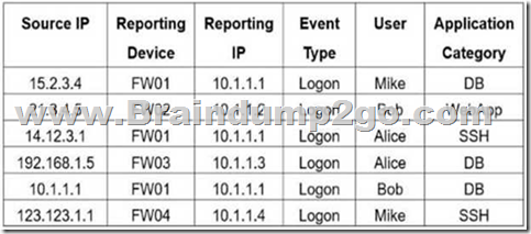 Grouping by Reporting Device, Reporting IP, and Application Category yields five unique tuples: (FW01, 10.1.1.1, DB), (FW02, 10.1.1.2, WebApp), (FW01, 10.1.1.1, SSH), (FW03, 10.1.1.3, DB), and (FW04, 10.1.1.4, SSH).