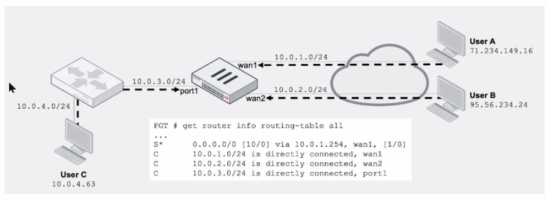 4. User B: Pass. FortiGate will use asymmetric routing using wan1 to reply to traffic for 95.56.234.24.