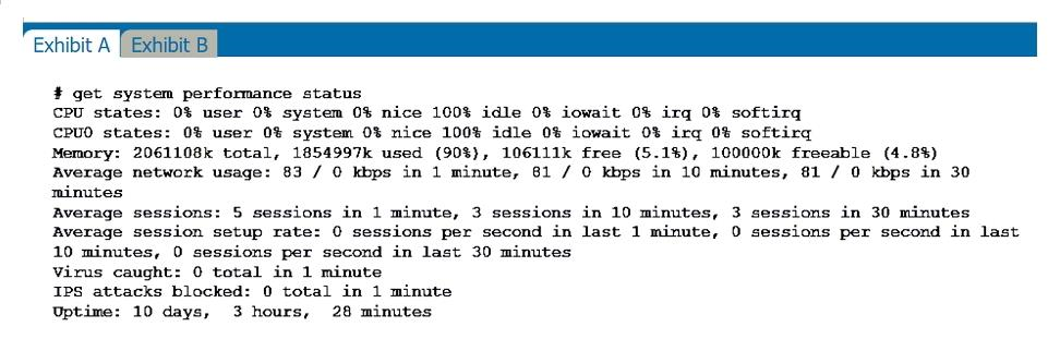 Exhibit A shows system performance output. Exhibit B shows a FortiGate configured with the default configuration of high memory usage thresholds. Based on the system performance output.