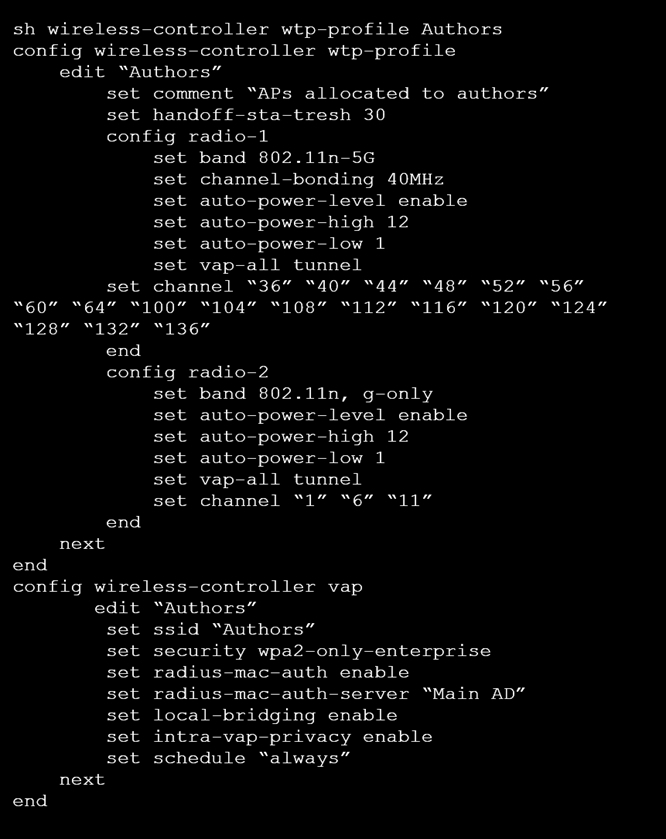 The configuration changes that will resolve the issue are to configure set vaps to be ''Authors'' for both interfaces in the wtp-profile, and to configure vap-all to be manual for both interfaces in the wtp-profile. This is because the current configuration does not assign any VAPs to the AP interfaces, which means that no wireless networks are broadcasted by the APs. The vap-all setting determines whether all VAPs are assigned to an interface or not, and the vaps setting specifies which VAPs are assigned to an interface. By setting vap-all to manual and vaps to ''Authors'', the APs will only broadcast the Authors wireless network on both interfaces. Disabling intra-vap-privacy for the Authors vap-wireless network will not help, as it only affects the communication between clients on the same SSID, not their connection to the AP. Increasing the transmission power of the AP radio interfaces will not help, as it only affects the signal strength and coverage of the APs, not their broadcasting of wireless networks.Reference:wireless-controller vap | FortiGate / FortiOS 6.4.0,Technical Note: How to configure intra-SSID privacy