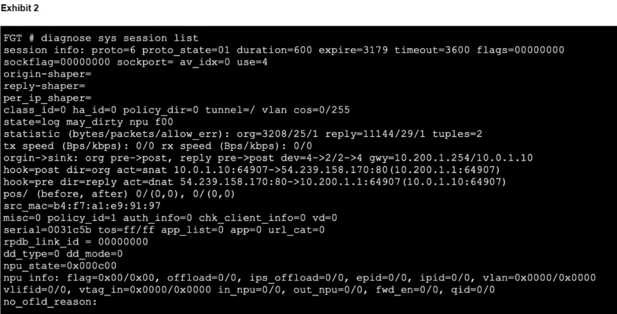 Refer to the exhibits, which show the configuration on FortiGate and partial session information for internet traffic from a user on the internal network.
