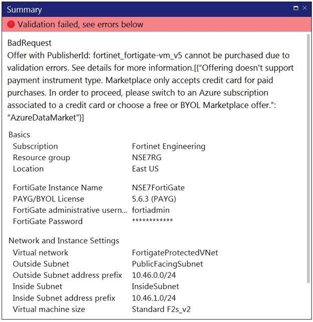 Refer to the exhibit. You are deploying a FortiGate-VM in Microsoft Azure using the PAYG/On-demand licensing model. After you configure the FortiGate-VM, the validation process fails, displaying the error shown in the exhibit.