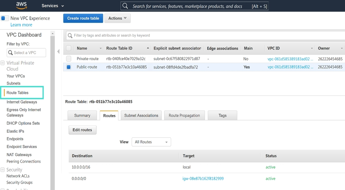 2. Deploy a NAT gateway with an EIP in the public subnet, edit route tables, select Public-route, and delete the route destination 10.0.0.0/16 to target local.