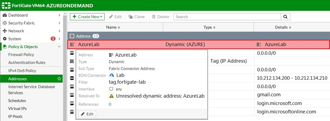 3. In the Microsoft Azure portal, access the windows server, obtain the private IP address, and assign the IP address under the FortiGate-VM AzureLab address object.