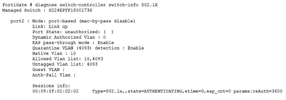 A host machine connected to port2 on FortiSwitch cannot connect to the network. All ports on FortiSwitch are assigned a security policy to enforce 802.1X port authentication. While troubleshooting the issue, the administrator runs the debug command and obtains the output shown in the exhibit.