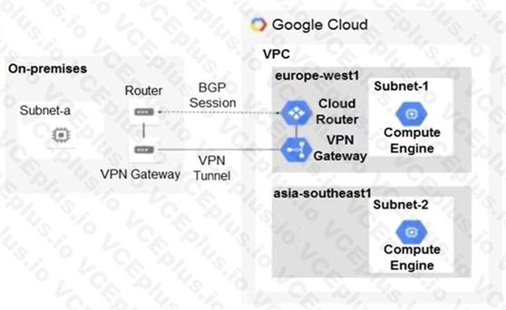 You have the following routing design. You discover that Compute Engine instances in Subnet-2 in the asia-southeast1 region cannot communicate with compute resources on-premises. What should you do?