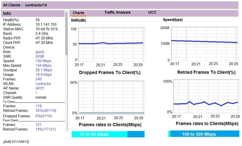 2. Client health is low, but SNR is high. It is possible data in the dashboard is not accurate and needs to be updated.