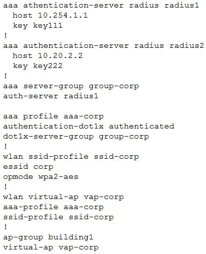 A point venture between two companies results in a fully functional WLAN Aruba solution. The network administrator uses the following script to integrate the WLAN solution with two radius servers, radius1 and radius2.