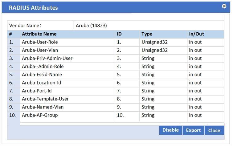 In the Aruba RADIUS dictionary shown, what is the purpose of the RADIUS attributes?