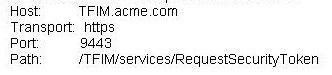 3. mqsicreateconfigurableservice BRK1 -c SecurityProfiles -o myTFIMv62Profile-n authentication,mapping,authorization,mappingConfig-v "WS-Trust v1.3 STS","WS-Trust v1.3 STS","WS-Trust v1.3 STS",https://tfim.acme.com:9443/TFIM/services/RequestSecurityToken
