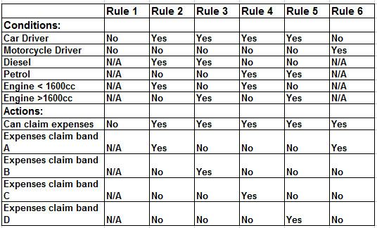 The decision table above reflects a golf club’s pricing structure for green fees and buggy/cart hire.