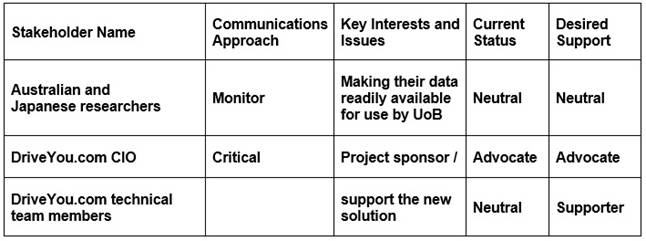 After the business case is approved and a project is initiated, the project manager needs to create a stakeholder communication plan to implement the change. Here is an extract from the plan: