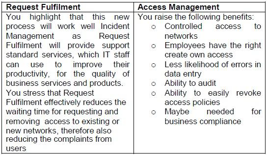 There is some confusion as to how the process of Access Management should be designed. In particular, there is debate as to how the process should be integrated into the overall approach of IT Service Management within Vision Media. The IT director has asked for submissions from some of her staff, describing how they think Access Management should be designed.