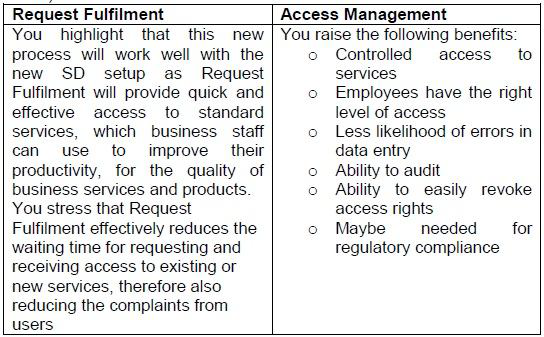 There is some confusion as to how the process of Access Management should be designed. In particular, there is debate as to how the process should be integrated into the overall approach of IT Service Management within Vision Media. The IT director has asked for submissions from some of her staff, describing how they think Access Management should be designed.